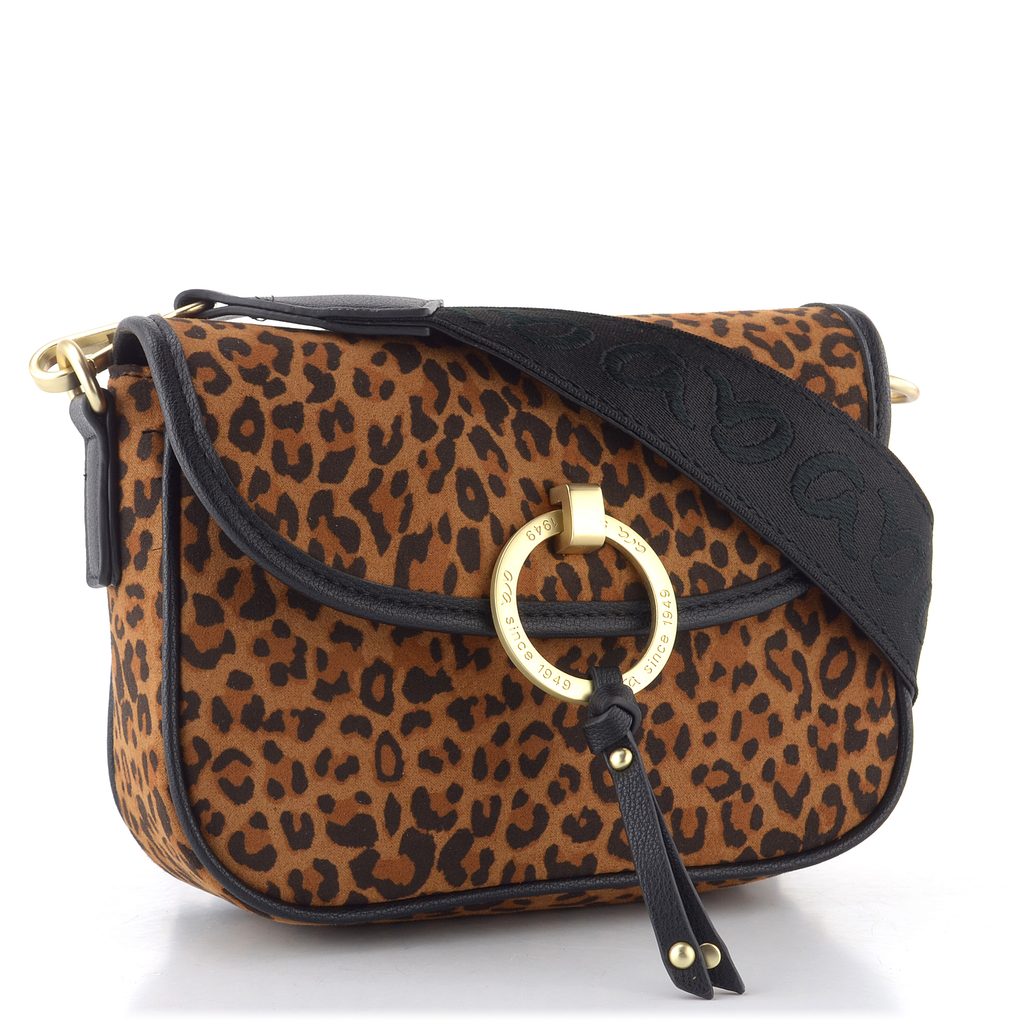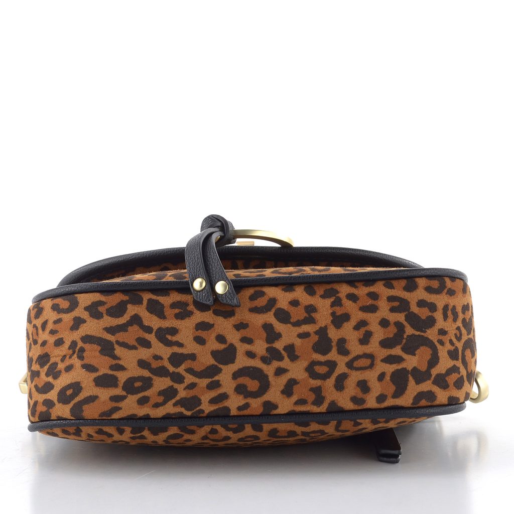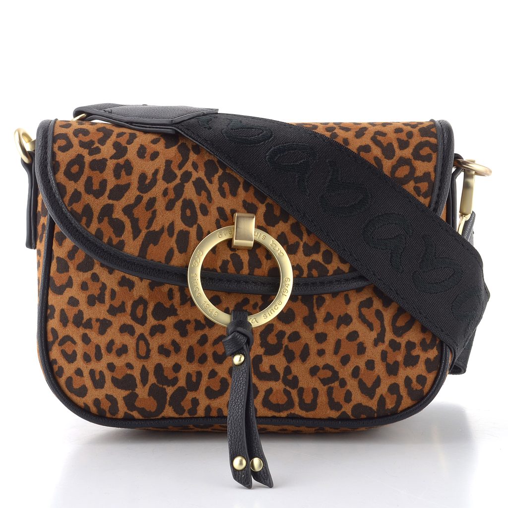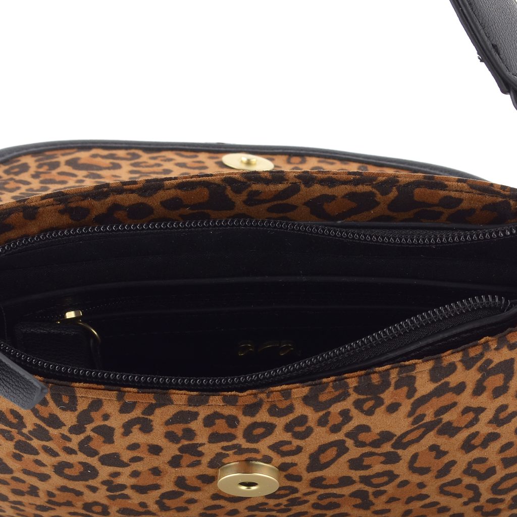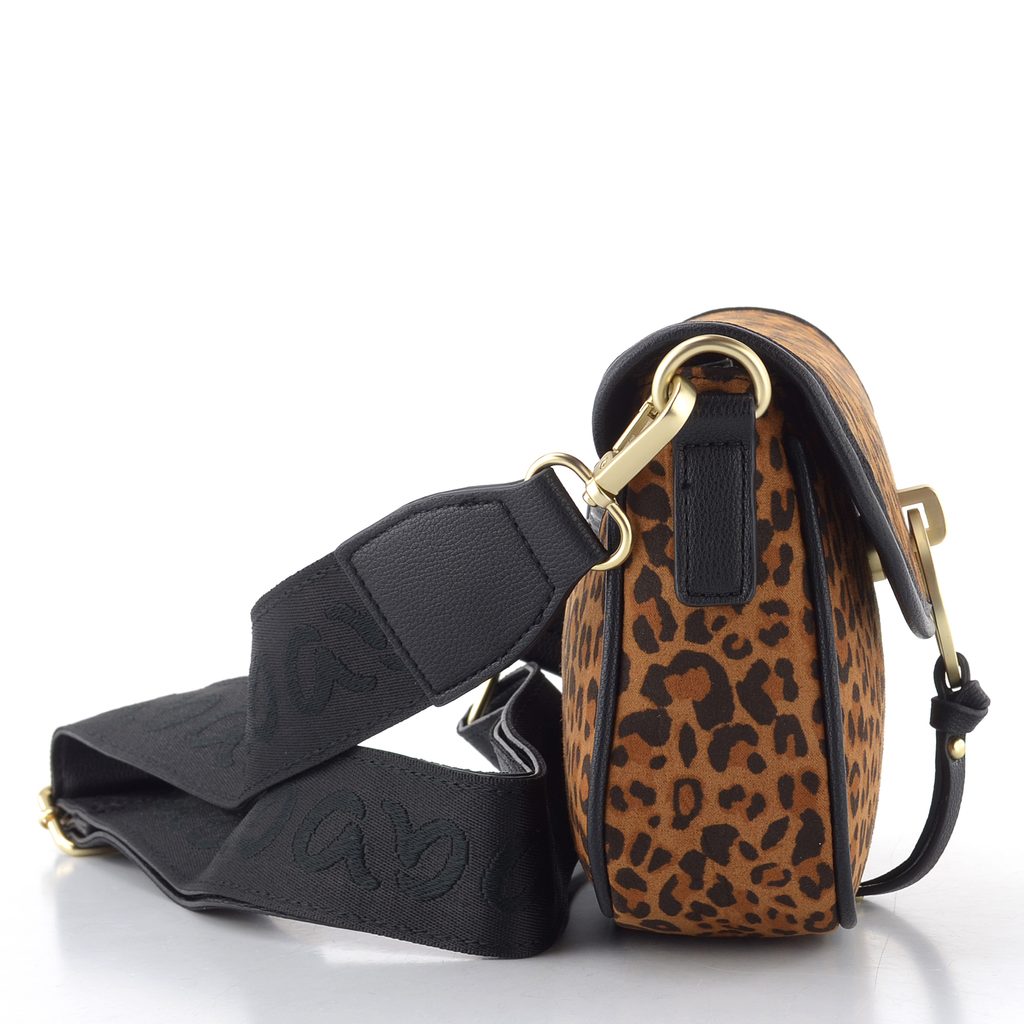 Malá dámska kabelka s leopardím vzorom, klopou a odopínateľným ramenným pásikom.