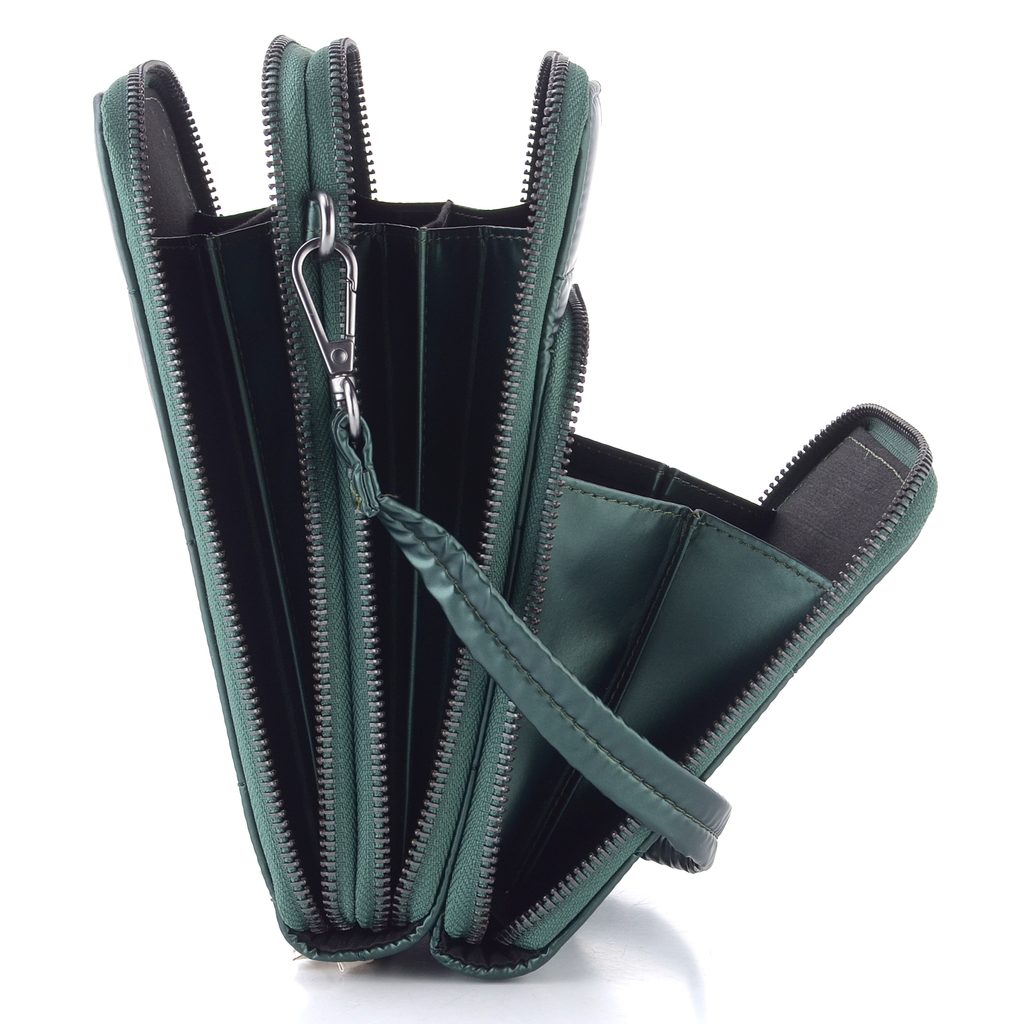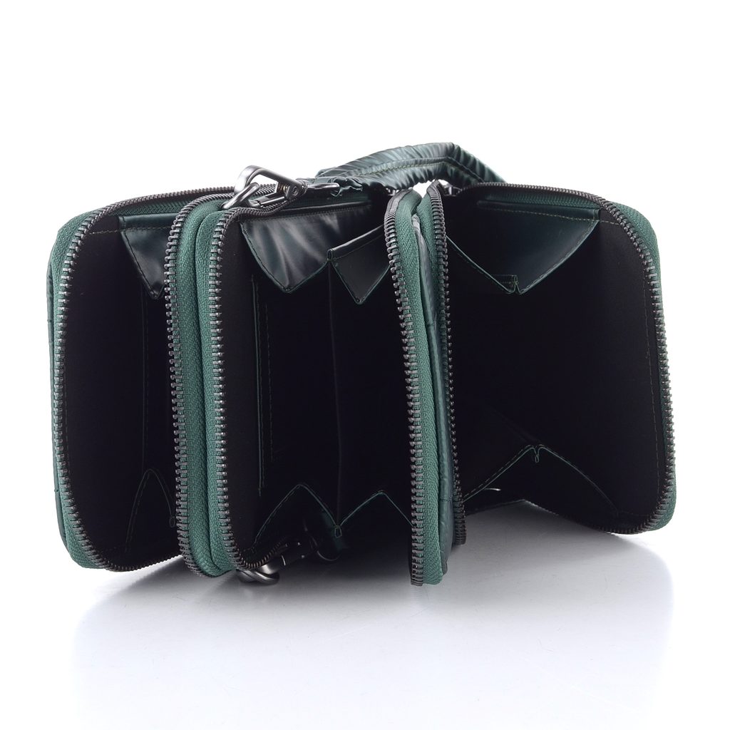Malá dámska crossbody kabelka v tmavo zelenej farbe s prešívaným vzorom a s variabilnými popruhmi.