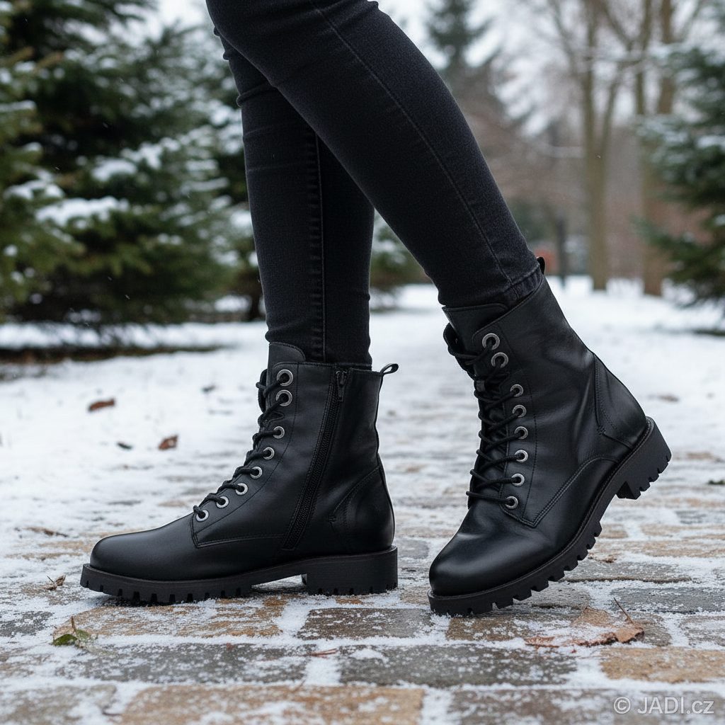 Dámský zateplený kotník z hladké kůže v černé barvě, s postranním zipem a šněrováním.