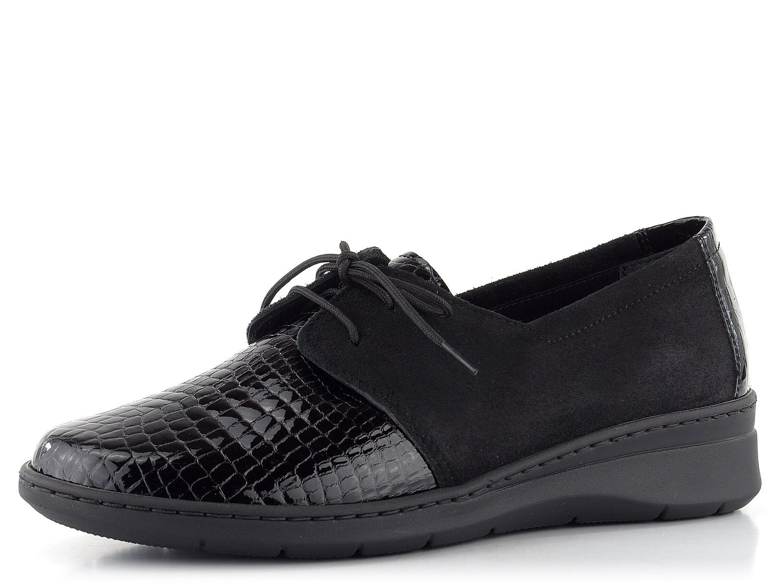 Zaujímavé dámske poltopánky z kroko lakovanej kože v kombinácii s jemným semišom.