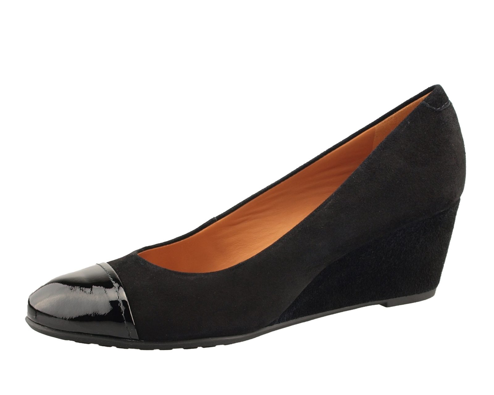 Luxusné lodičky na klinovom opätku GEOX budú určite dobrou voľbou nielen na bežné nosenie, ale zároveň aj na slávnostnejšie príležitosti. Lodičky sú z hladkého čierneho nubuku, oživené lakovanou špičkou taktiež v čiernom odtieni. Lodičky sú vysoko komfortné, vnútorná časť je podšitá hladkou hovädzinou, nášľapná stielka je extra vystlaná pre príjemný došľap, v prstovej časti navyše doplnená perforáciou pre správnu cirkuláciu vzduchu. Nubukový opätok zaistí pevné pridržanie päty počas chôdze. Módny stabilný klinový opätok s výškou 5 cm podporí pohodlie počas chôdze. Podrážka, ktorá "dýcha" je vysoká cca 0,5 cm.