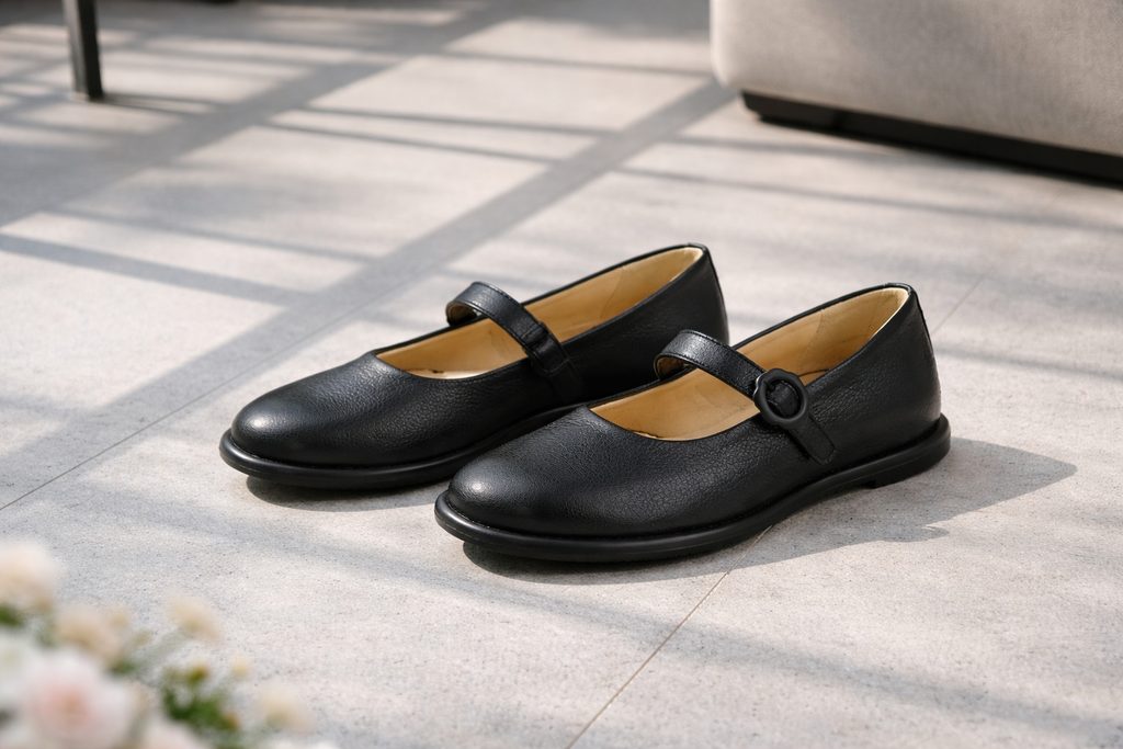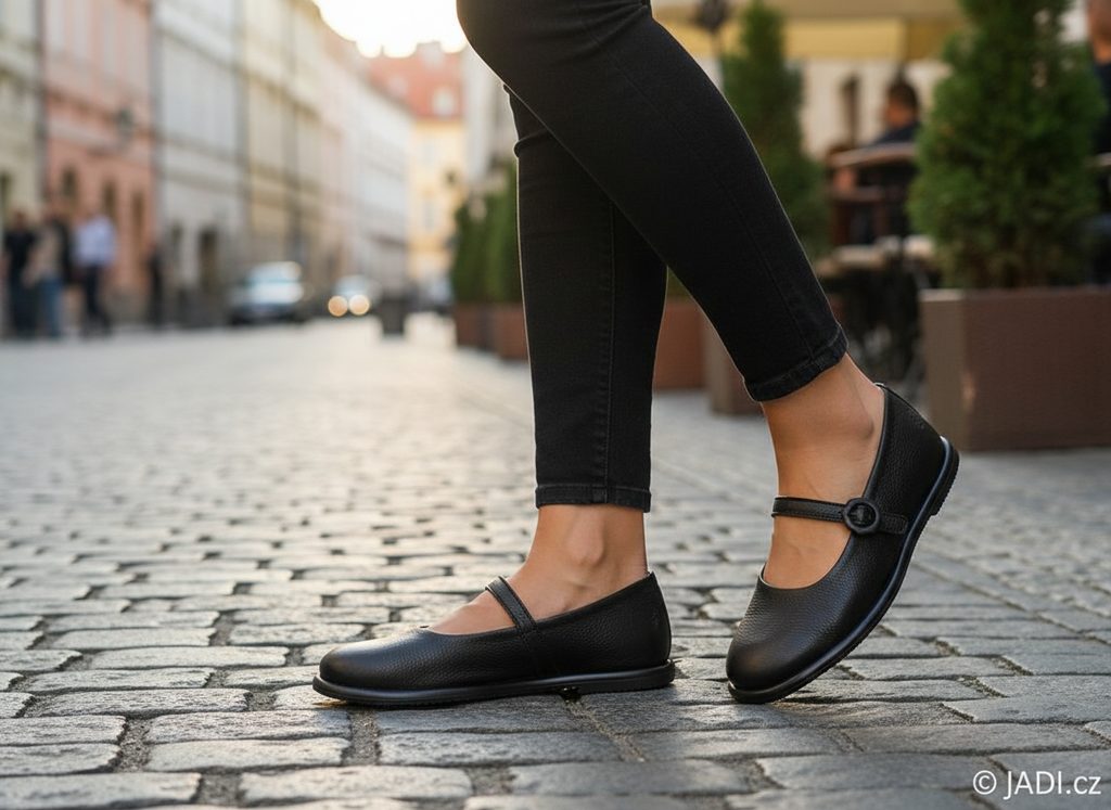 Komfortné dámske kožené baleríny v čiernej farbe s nastaviteľným priehlavkovým pásikom.