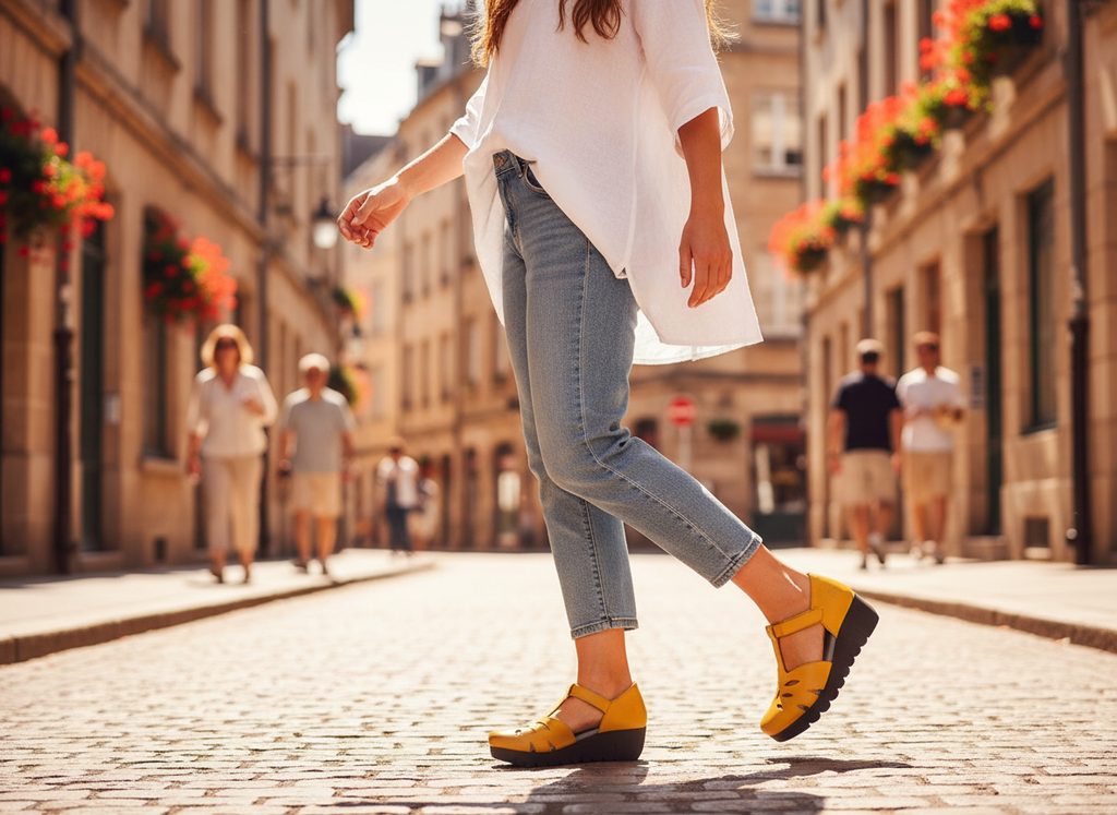 Dámské kožené sandály na klínu v líbivé hořčicové barvě od luxusní značky Fly London.