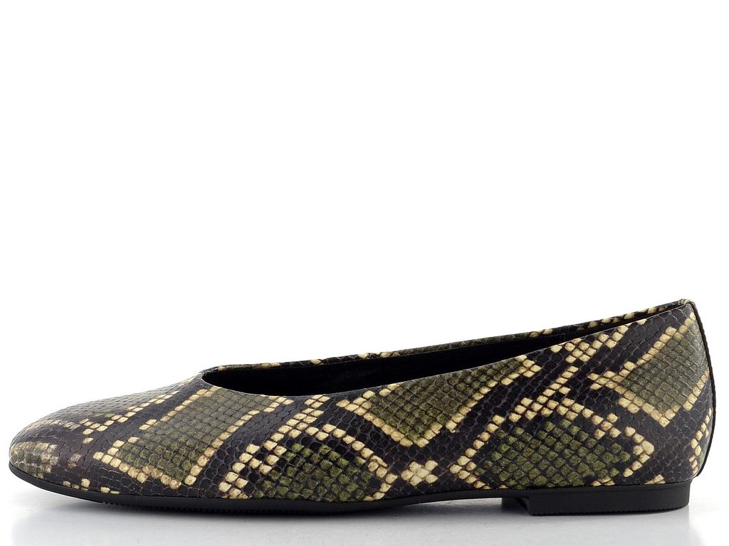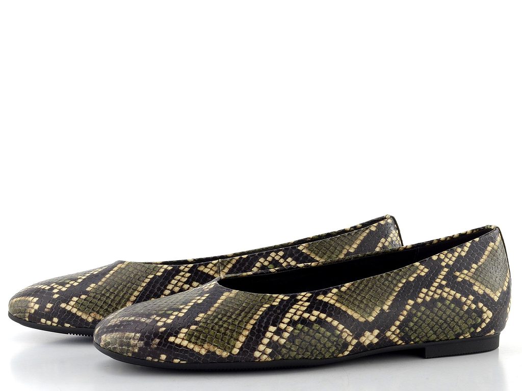 Dámske baleríny v celokoženom prevedení s hadinkovým vzorom a nízkym podpätkom.