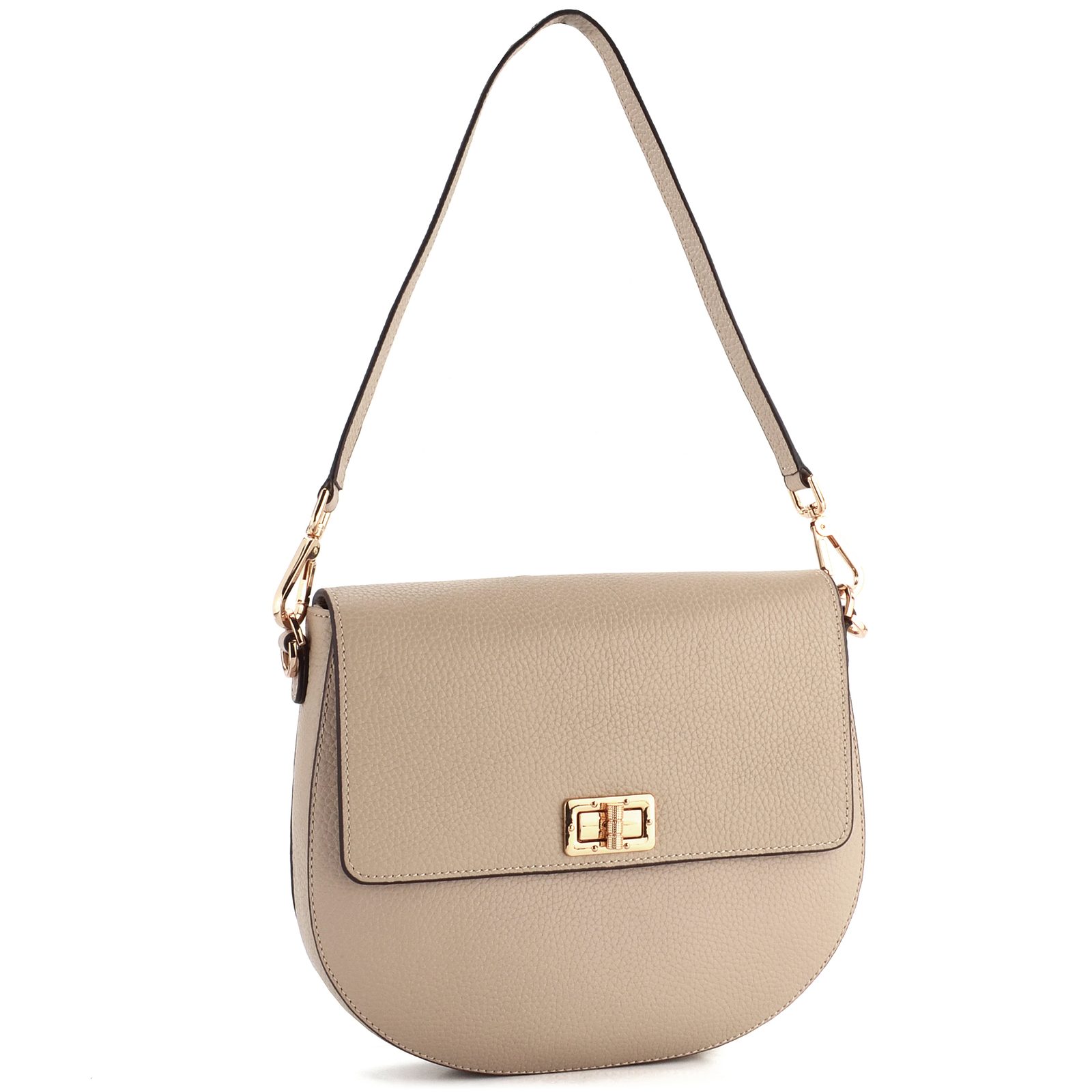 Menšia kožená kabelka vo svetlej béžovej farbe s klopou na kovový otočný mechanizmus a s dvoma odopínateľnými popruhmi.