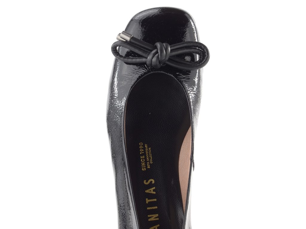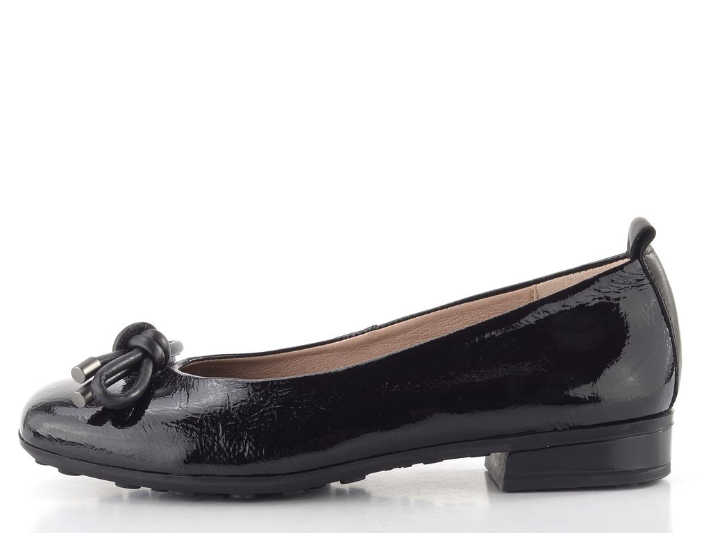 Dámske baleríny v čiernej farbe z pokrčenej lakovanej kože, doplnené ozdobnou mašličkou na špičke.