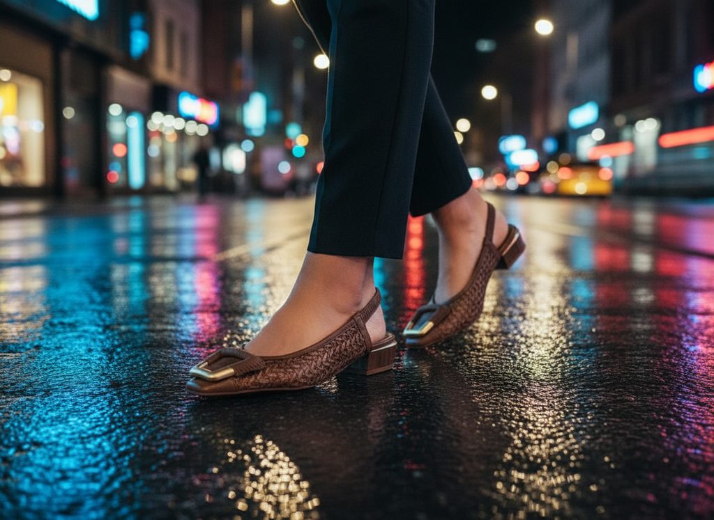 Luxusné dámske lodičky z hladkej kože a splietaného lyka, s elegantnou úzkou špičkou, nízkym podpätkom a voľnou pätou.