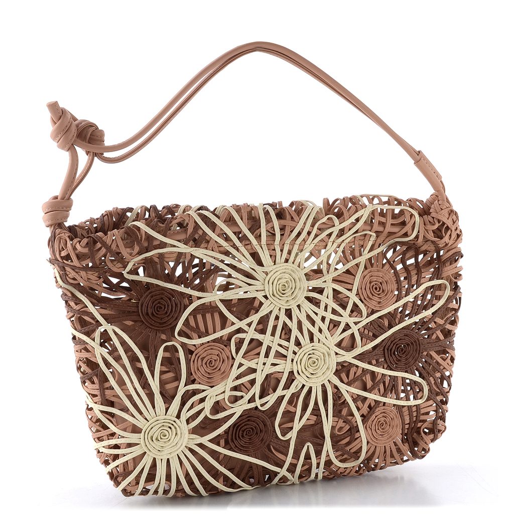 Originálna dámska kabelka cez rameno z tenkých pásikov skladaných do kvetinového motívu a s vyberateľnou vnútornou etue.