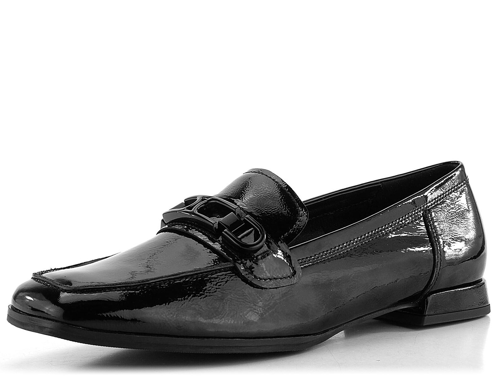 Dámske mokasíny z lakovanej kože v čiernej farbe s ozdobným kovaním na priehlavku a nízkym podpätkom.