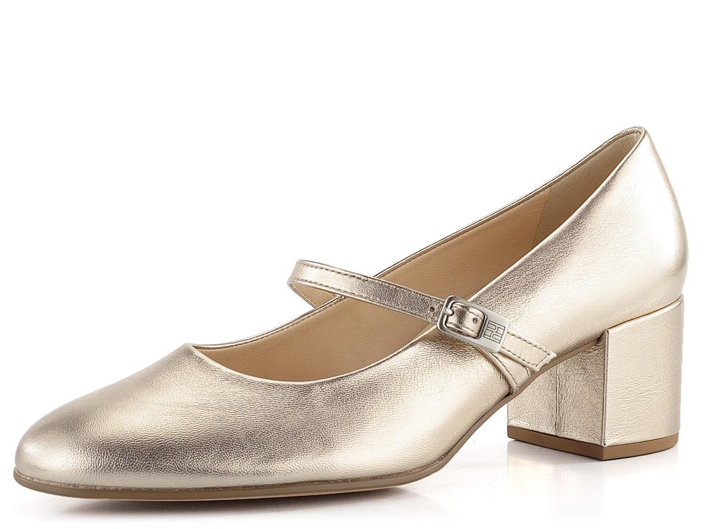 Luxusné dámske lodičky z metalickej kože vo svetlo bronzovej farbe, s priehlavkovým pásikom a širokým podpätkom.