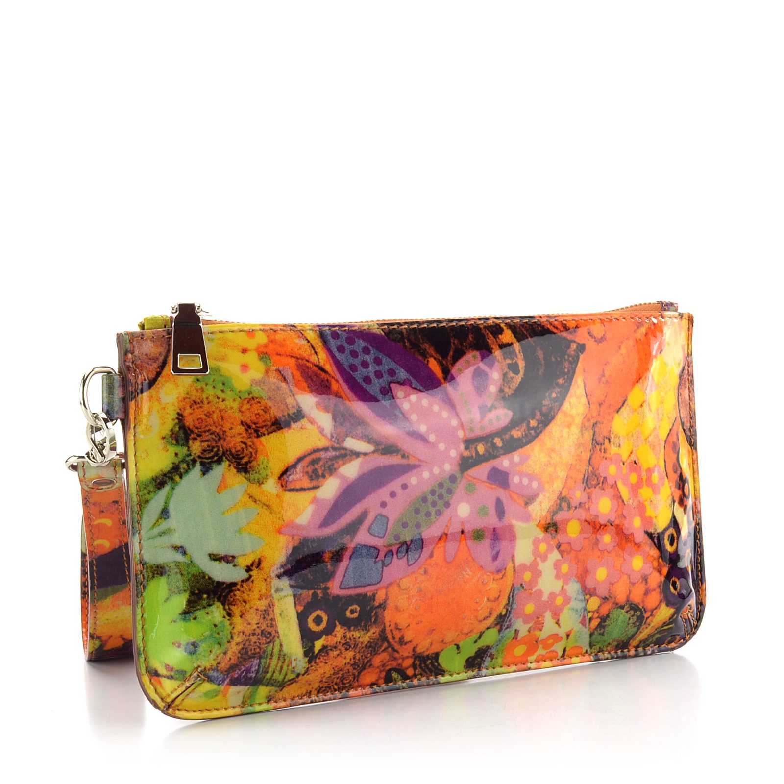 Luxusná lakovaná kožená listová kabelka na zápästie s farebným motívom.