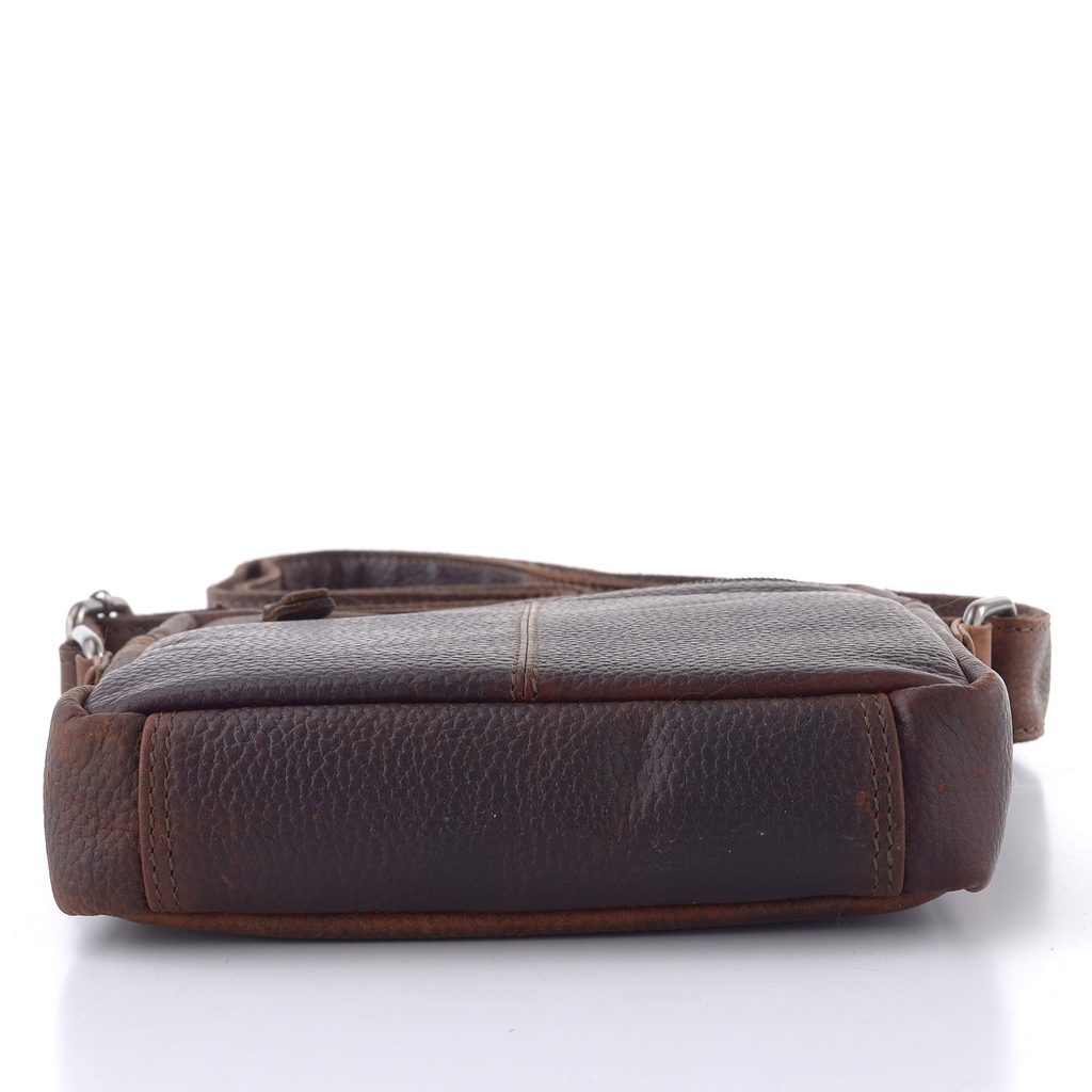 Praktická crossbody kabela z pevnej kože v hnedej farbe s nastaviteľným ramenným popruhom.