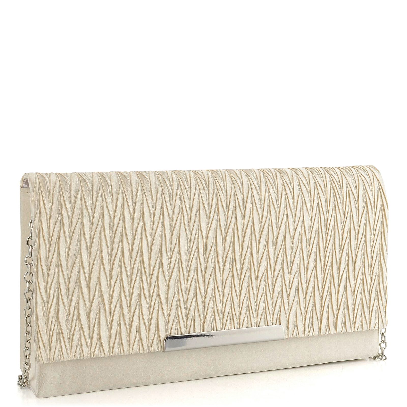Dámska spoločenská listová kabelka zo svetlého saténu a s odopínateľnou ramennou retiazkou.