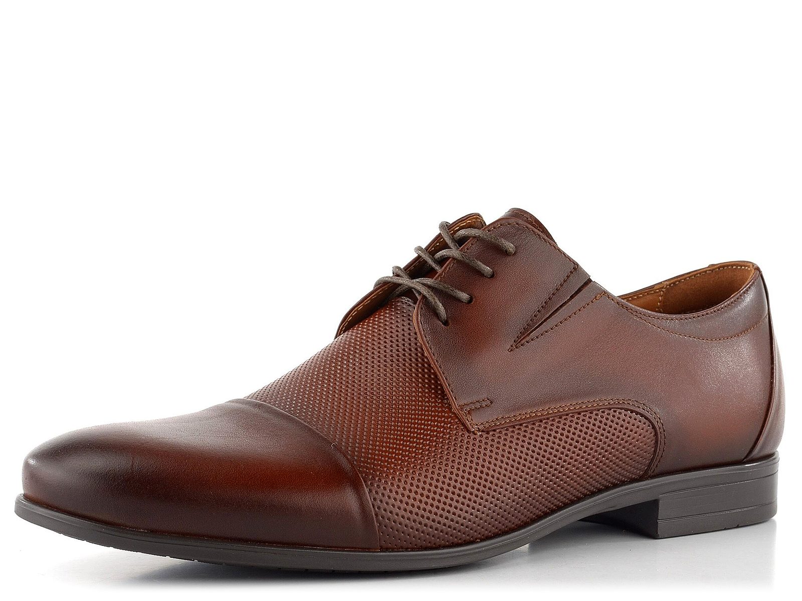Luxusné pánske kožené poltopánky v koňakovo hnedej farbe, so šnurovaním a ozdobnou perforáciou.