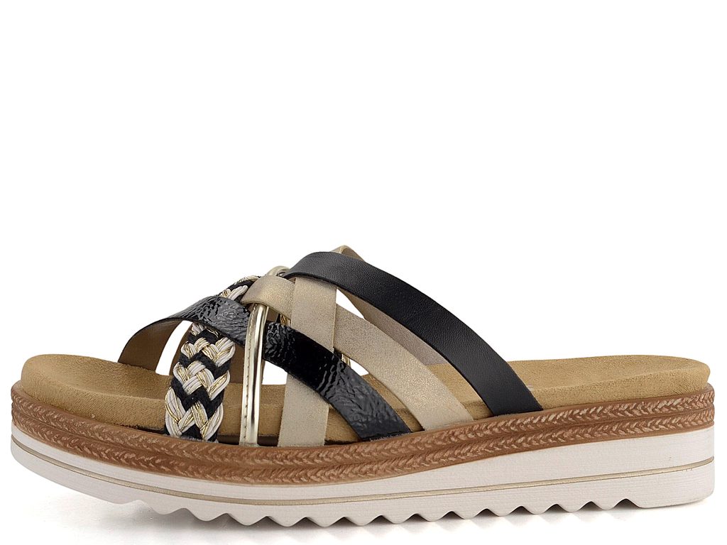 Pohodlné dámske šľapky na platforme s kríženými pásikmi v čierno-zlatej farebnej kombinácii.
