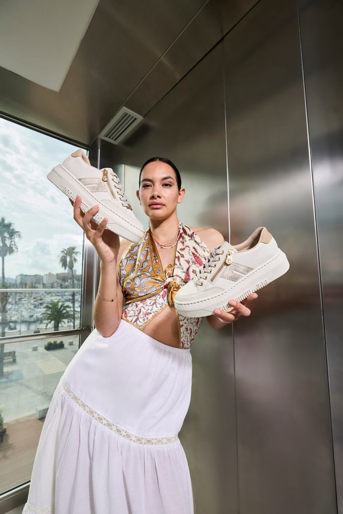 Štýlové dámske tenisky vo svetlej farbe s metalickým doplnkom od značky Rieker.