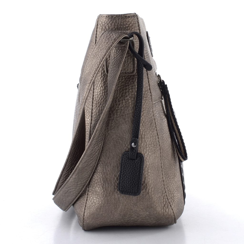 Módna a trendová kabelka v metalickom prevedení s čiernymi doplnkami, ktorú je možné nosiť klasicky alebo ako crossbody.