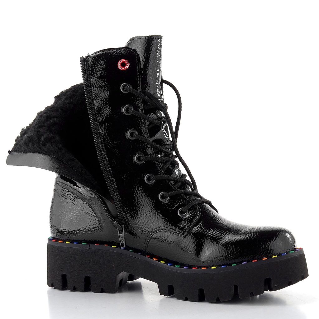 Šněrovací dámský kotník v černém lakovaném provedená, s teplou podšívkou, postranním zipem a vysokou hrubou podešví.