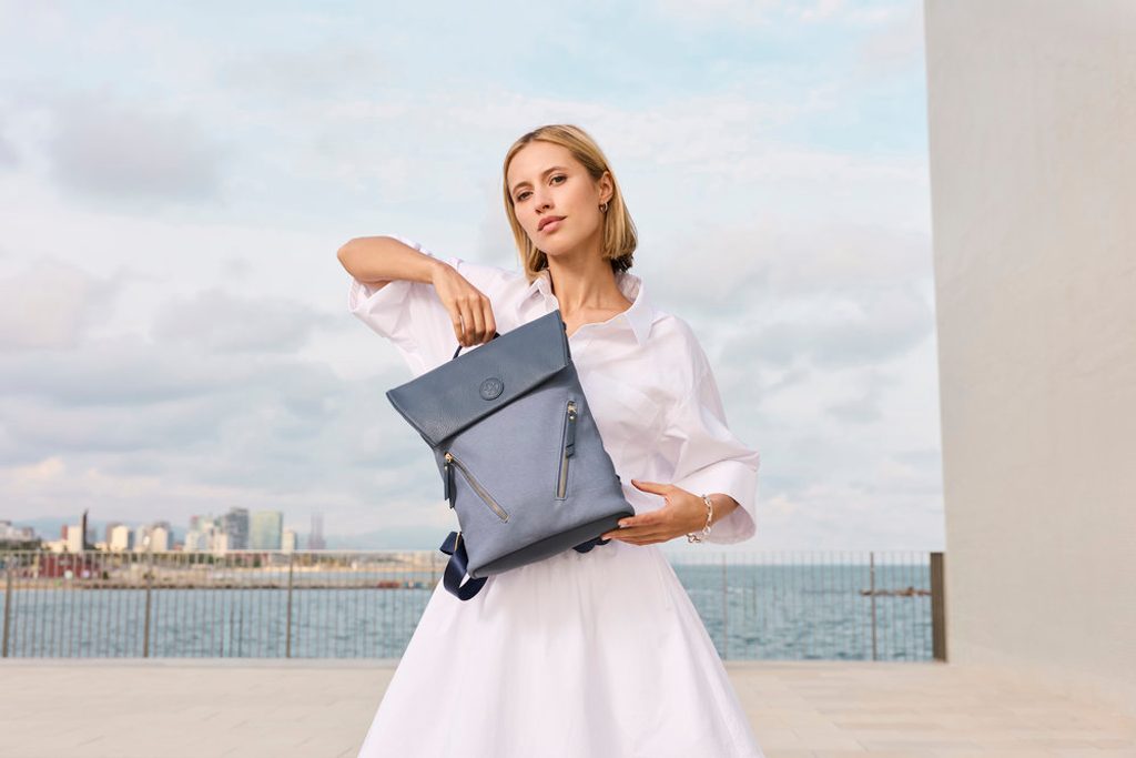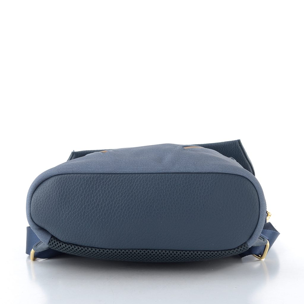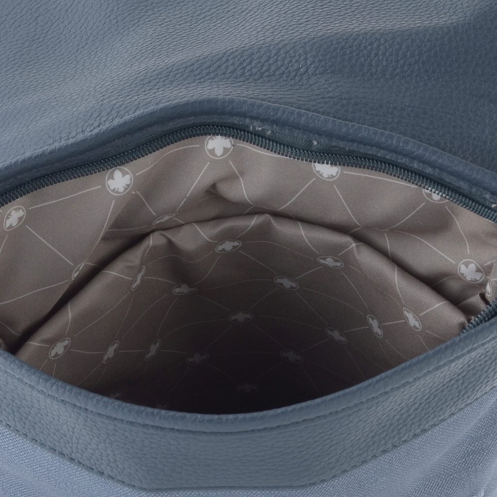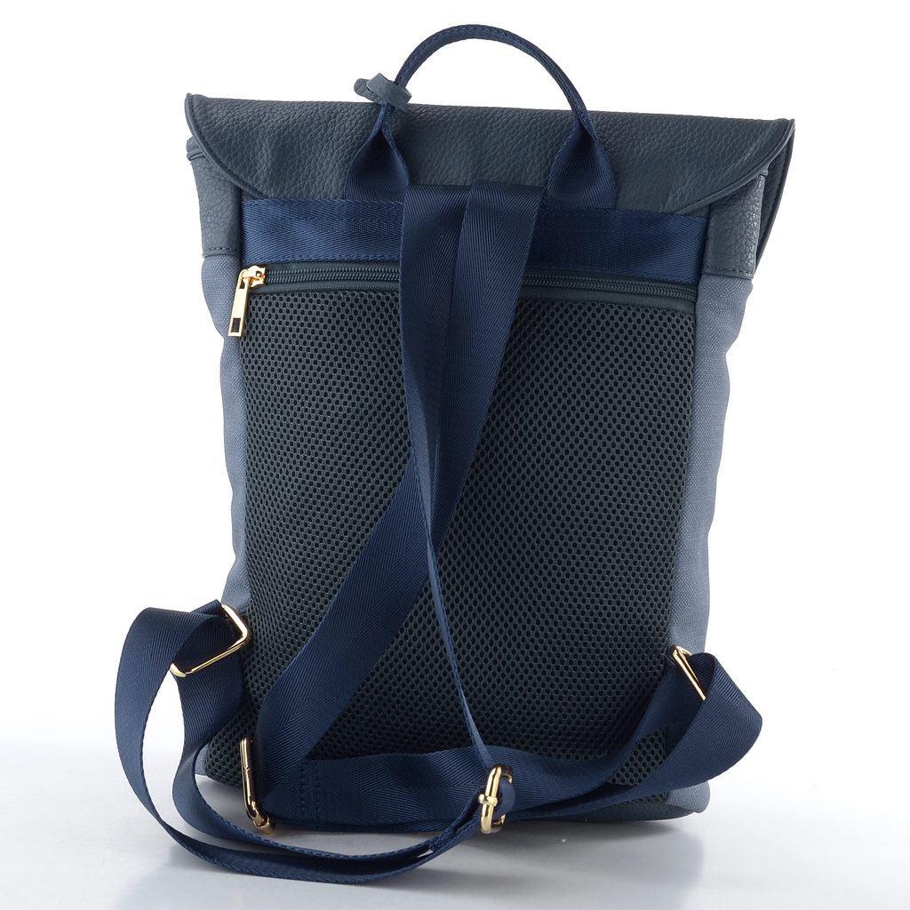 Mestský dámsky batôžtek v šedomodrej farbe, s klopou na magnetický cvok a priestorom pre tablet.