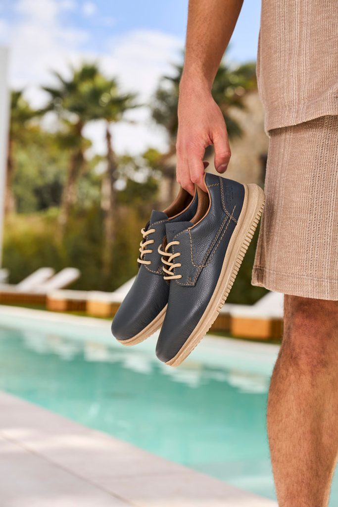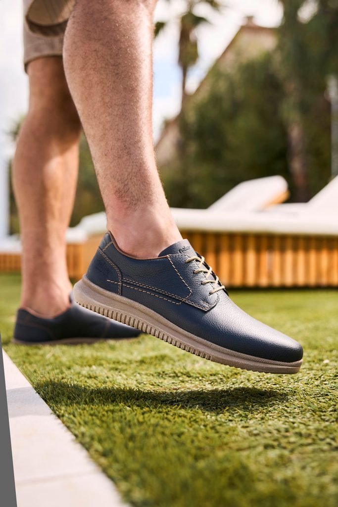 Ležérny model pánskych šnurovacích poltopánok zo štruktúrovanej kože v tmavo modrej farbe a v širšom strihovom prevedení.