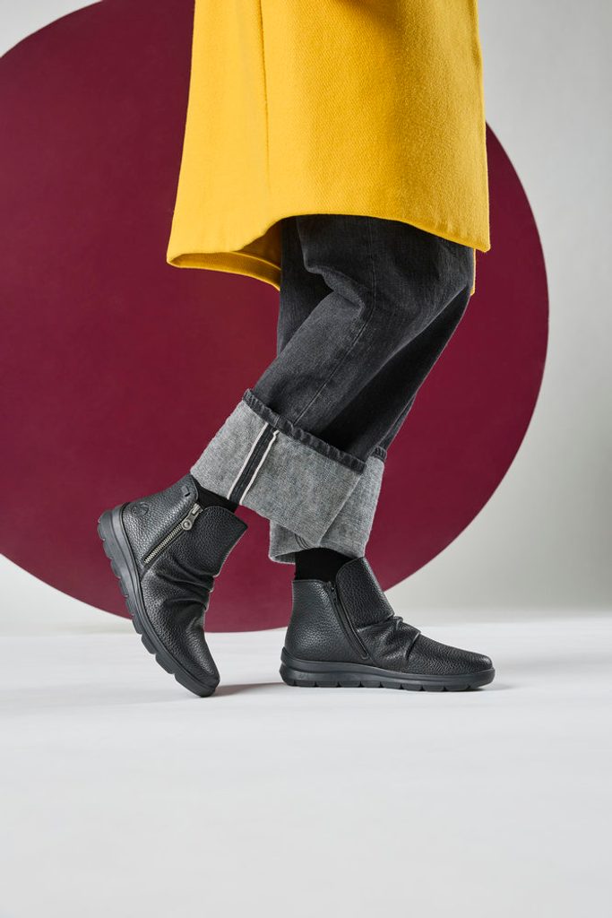 Kožené dámské kotníkové Riekerky s mírným zateplením a dvěma zipy pro snadné obutí.