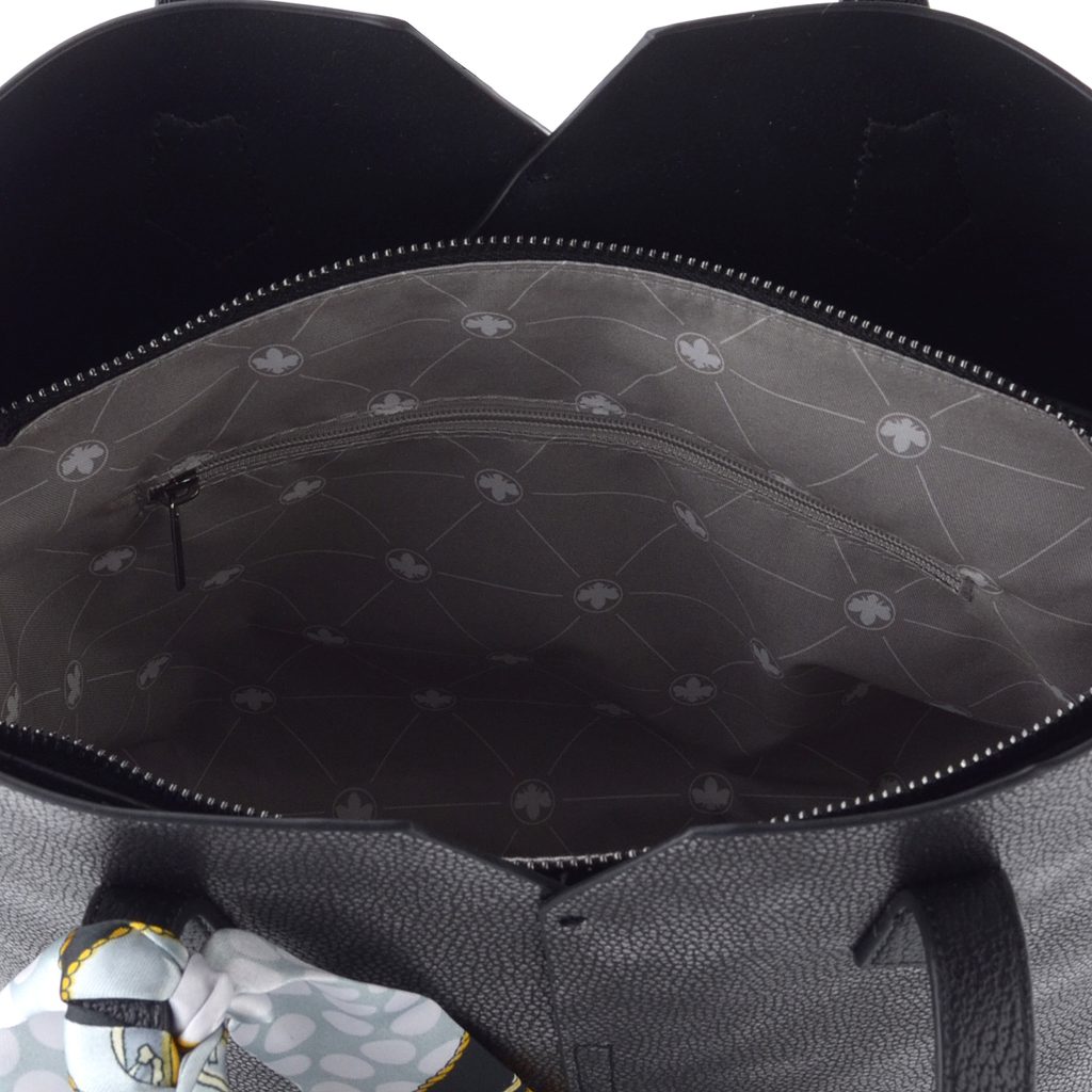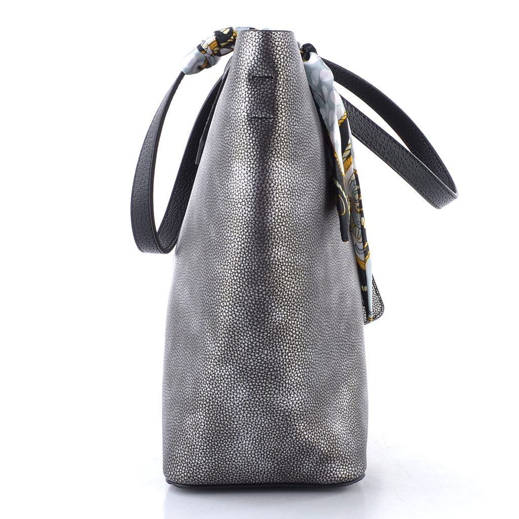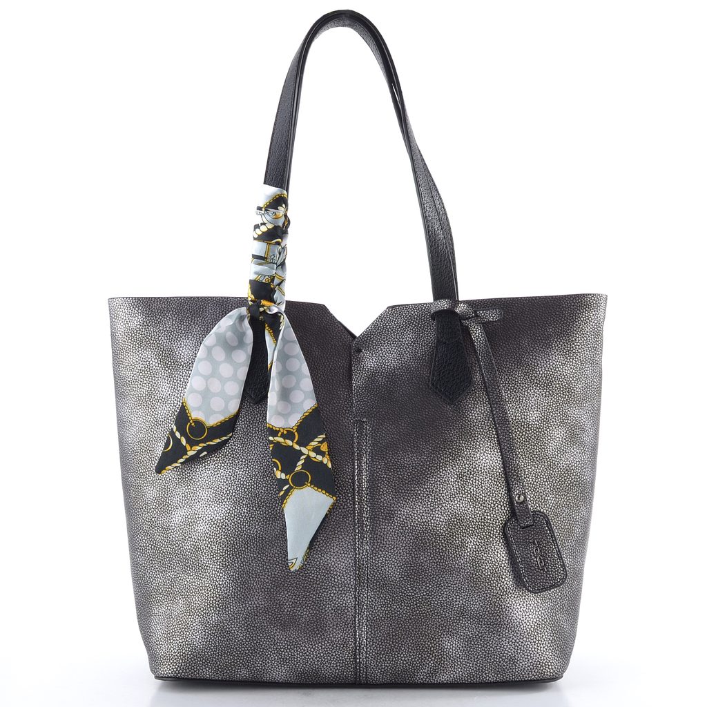 Jednoduchá a elegantná dámska shopper kabelka v starostriebornej farbe s ozdobnou farebnou stuhou.