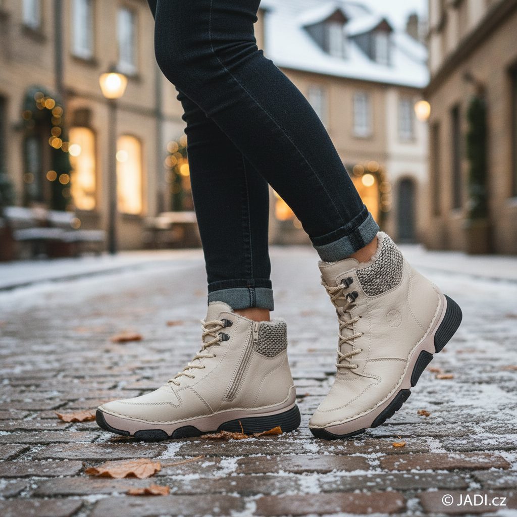Dámský komfortní šněrovací kotník v béžové barvě, s lehkou šitou konstrukcí a teplou podšívkou uvnitř.