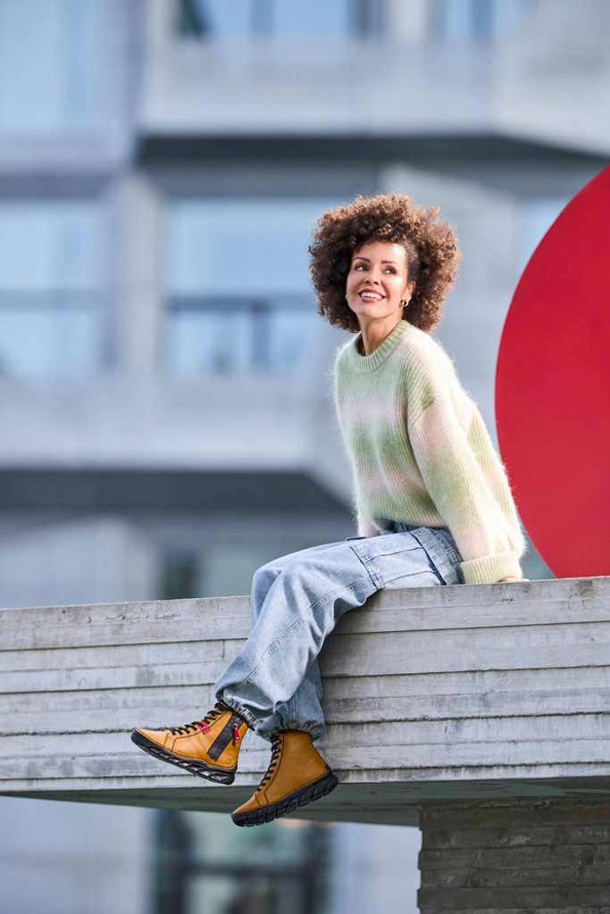 Zimní dámský šněrovací kotník v neobvyklé žluté barvě na od značky Rieker.