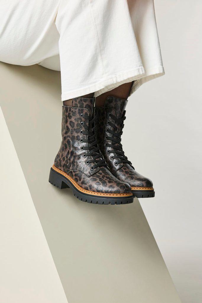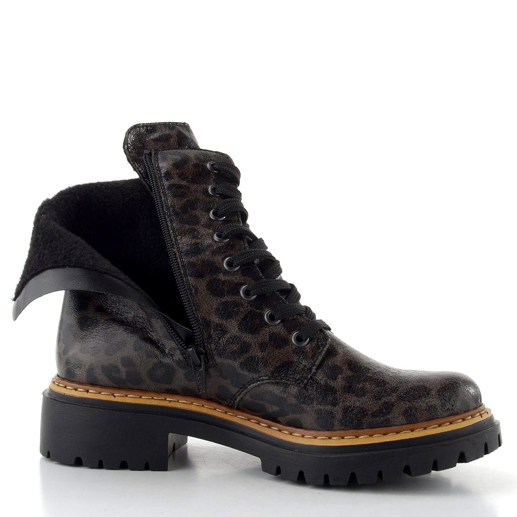 Šněrovací dámský kotník se zvířecím vzorem, teplou podšívkou, postranním zipem a bytelnou podešví.