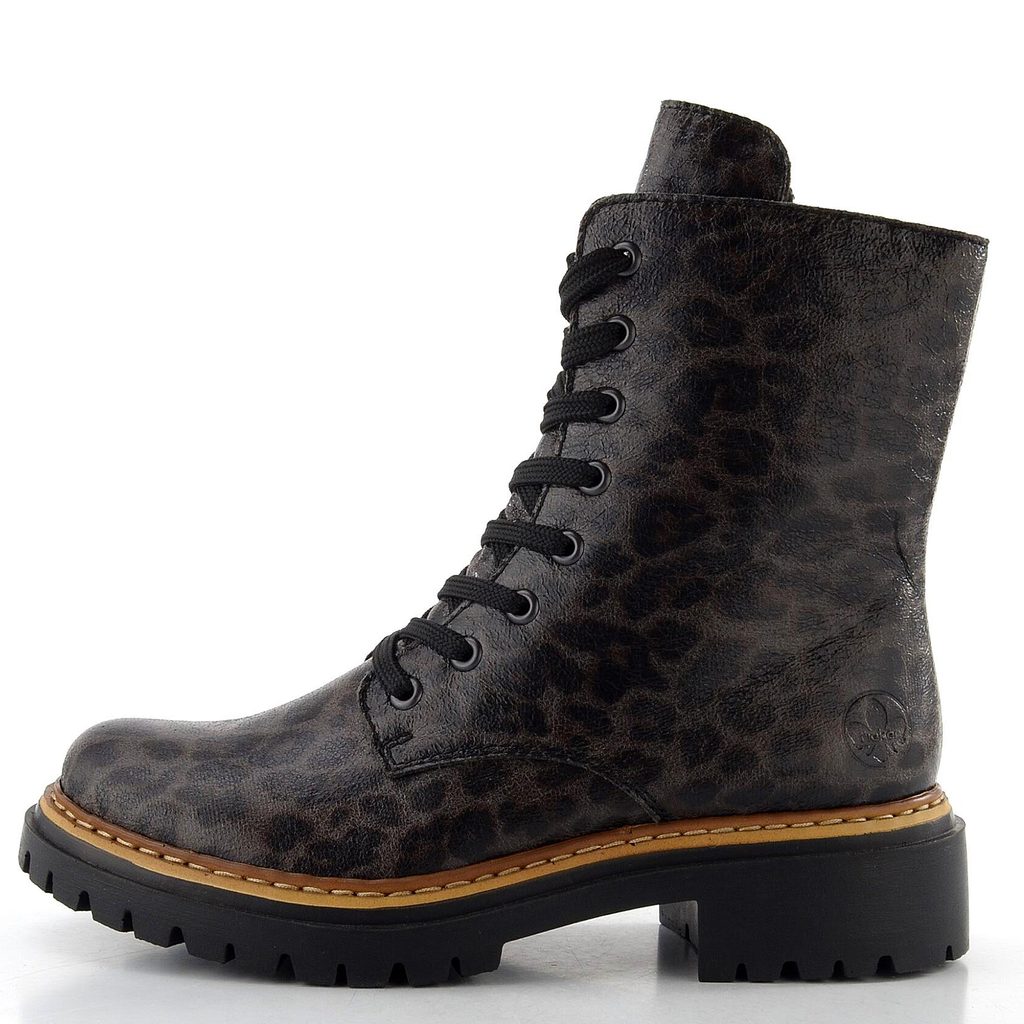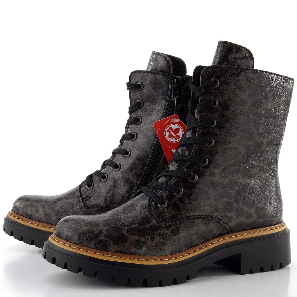 Robustnější dámský kotník s leopardím vzorem v šedé barvě od značky Rieker.