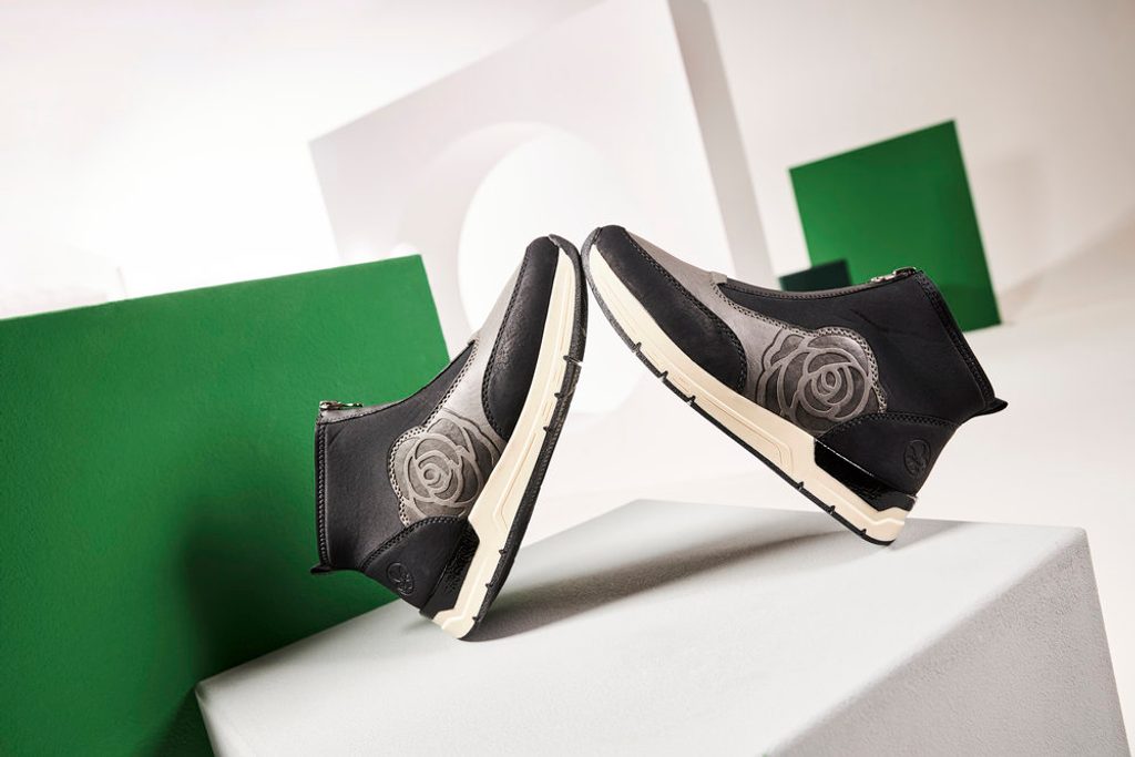 Štýlová členková obuv na kline v šedo-čiernej farebnej kombinácii od značky Rieker.