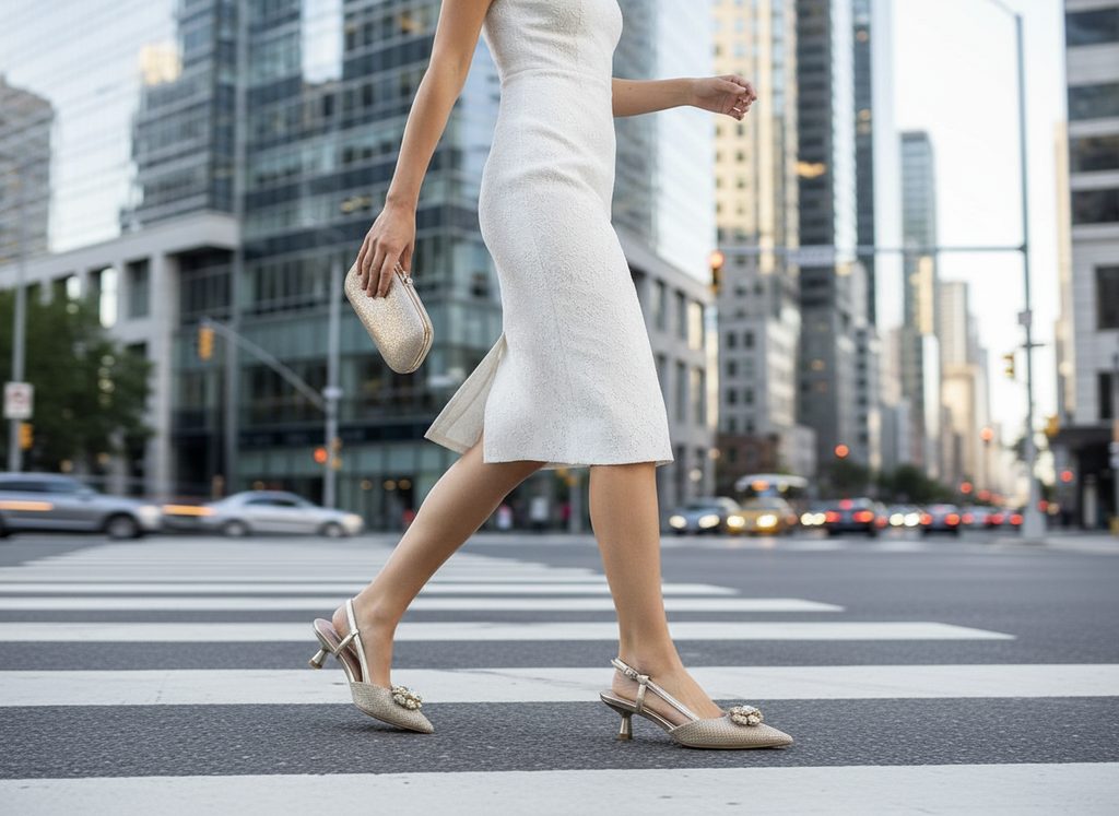 Dámske spoločenské lodičky v špicatom strihu, s voľnou pätou a módnym podpätkom.