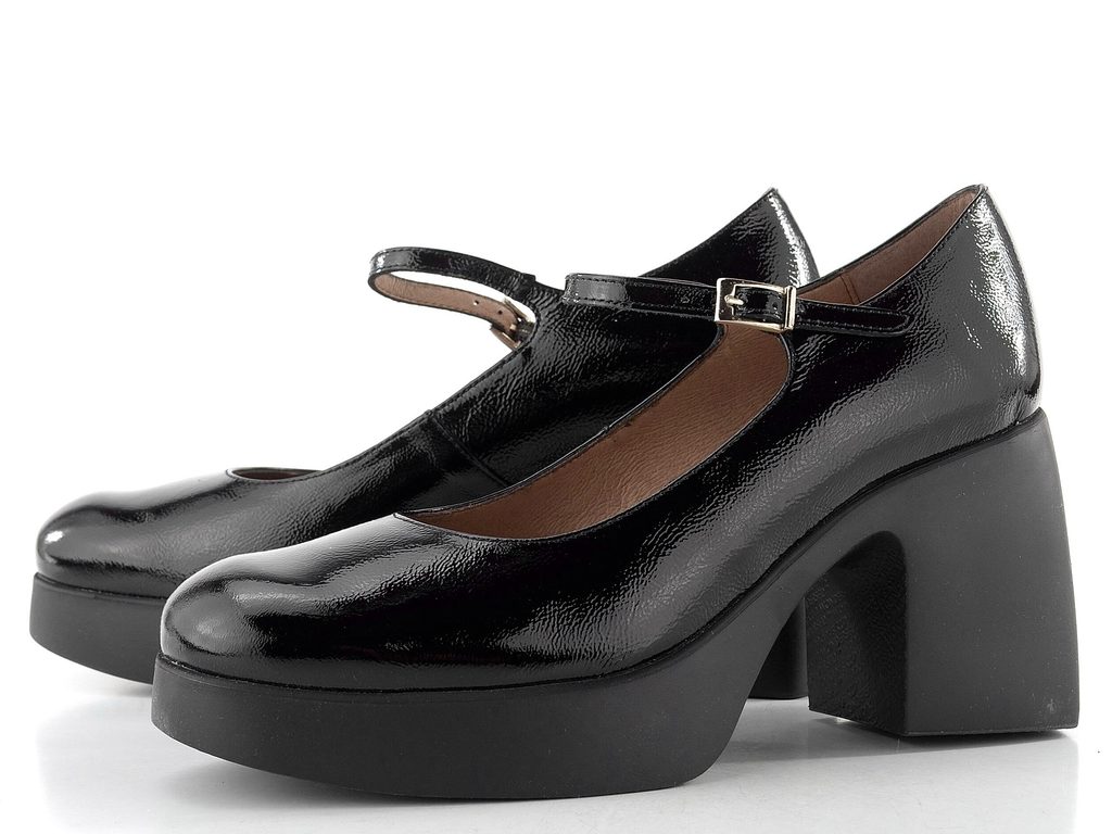 Dámske kožené lakované lodičky na platforme s priehlavkovým pásikom a vysokým, dominantným podpätkom.