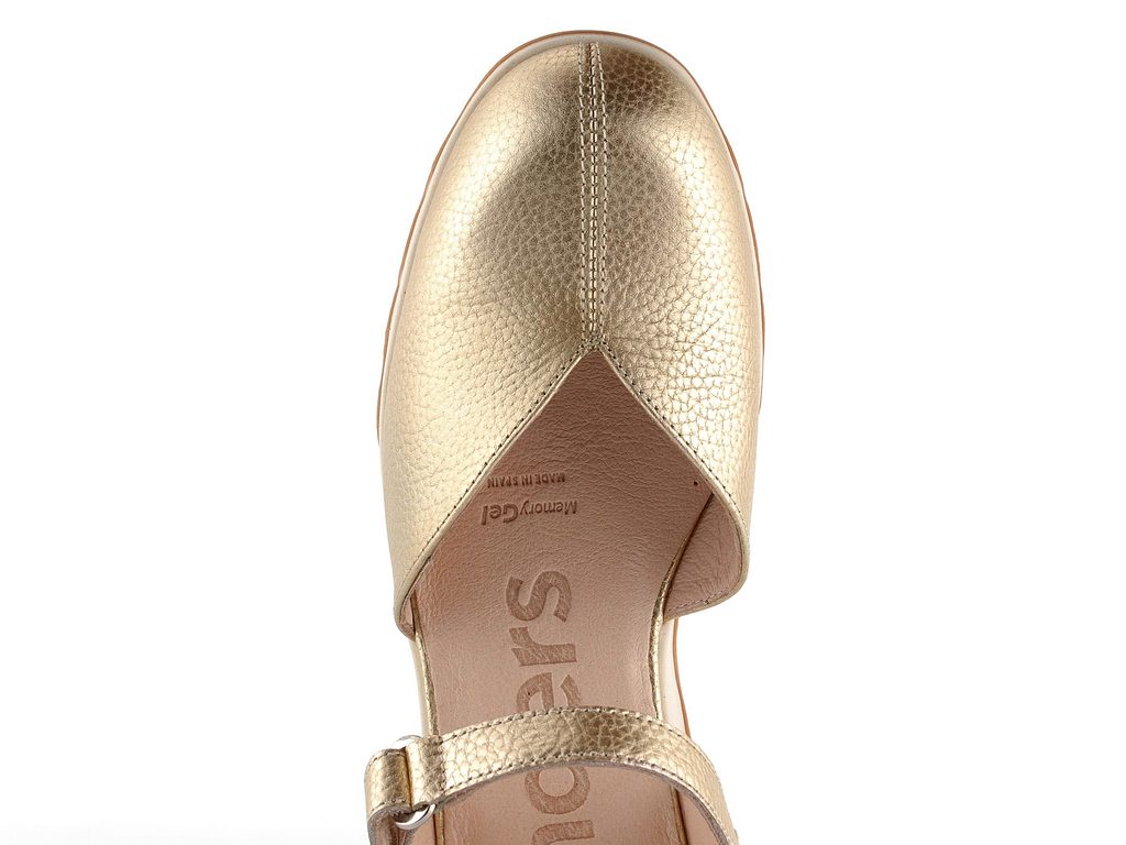 Dámske metalické sandále v platinovej zlatej farbe s plnou špičkou a pohodlným klinom.