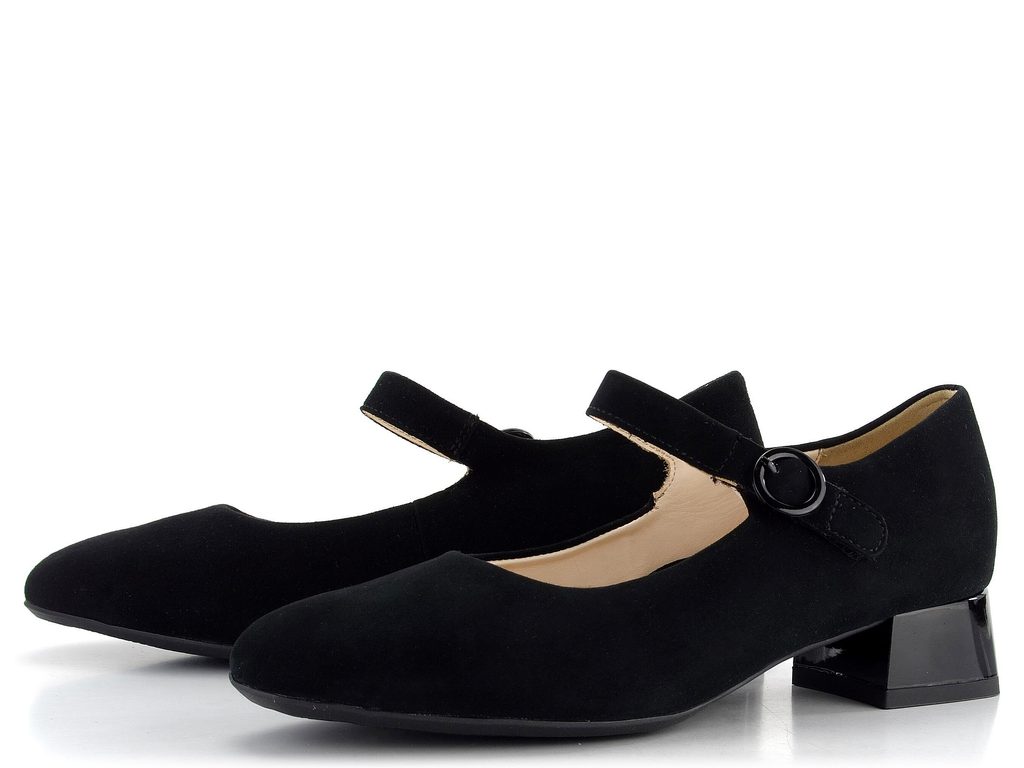Komfortné dámske lodičky zo semišovej kože v čiernej farbe, v širšom strihovom prevedení s pásikom na suchý zips.